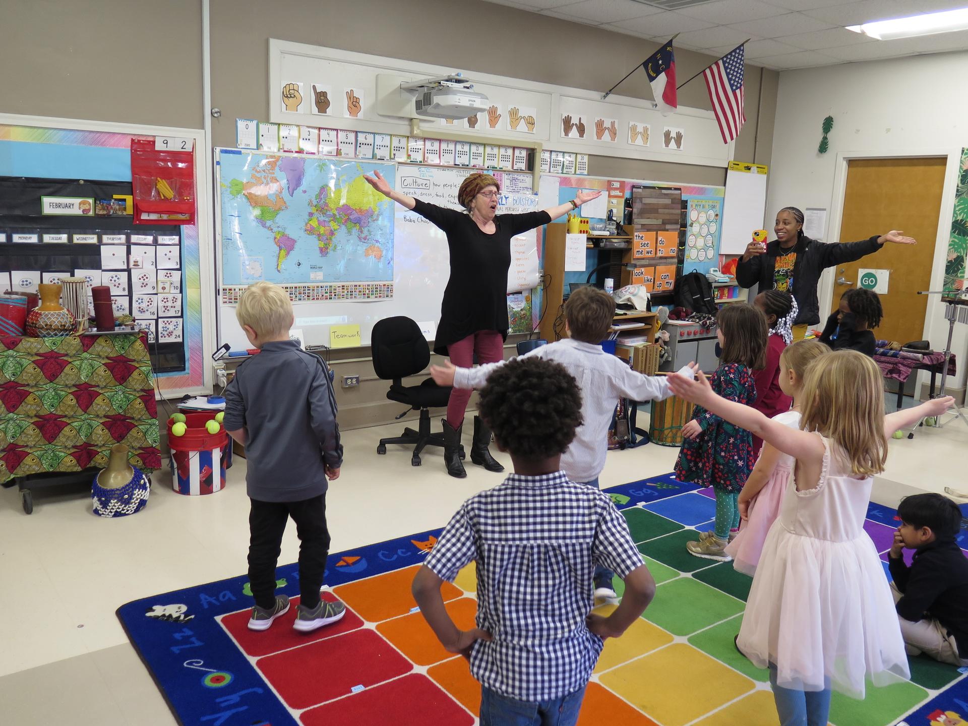 Photo: CAPS Artist, Beverly Botts drumming and dancing with young students |